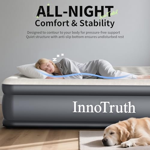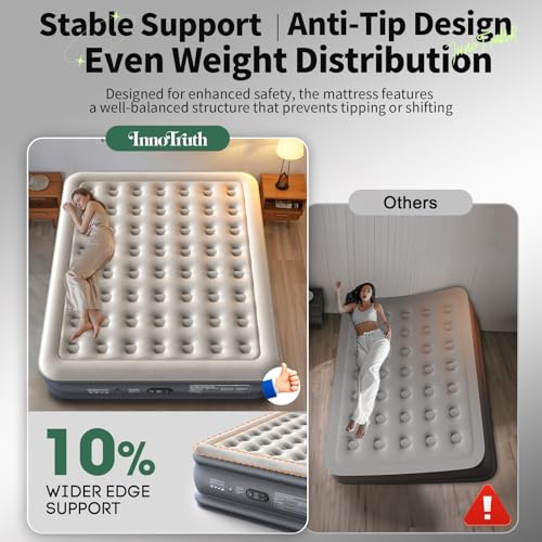 𝐏𝐫𝐞𝐦𝐢𝐮𝐦-𝐆𝐫𝐚𝐝𝐞 𝐌𝐚𝐭𝐞𝐫𝐢𝐚𝐥𝐬: Made with 10% thicker, upgraded PVC, the InnoTruth airbed provides enhanced durability and reliable support. Its reinforced surface resists daily wear and tear, while the quiet, non-slip base keeps the mattress securely in place throughout the night